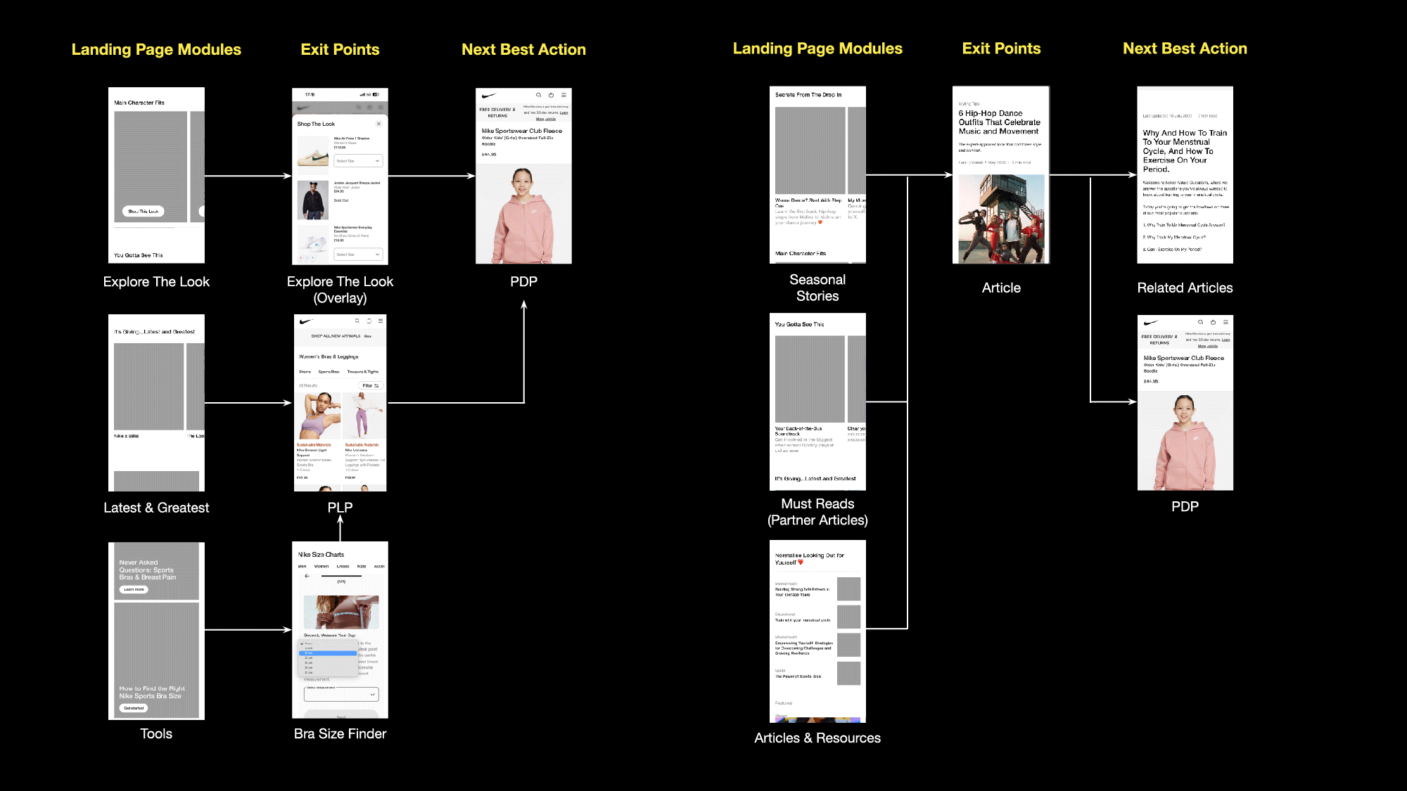 The following journey shows how the different editorial modules on the landing page lead to either related articles for continued browsing or PDP for shopping.